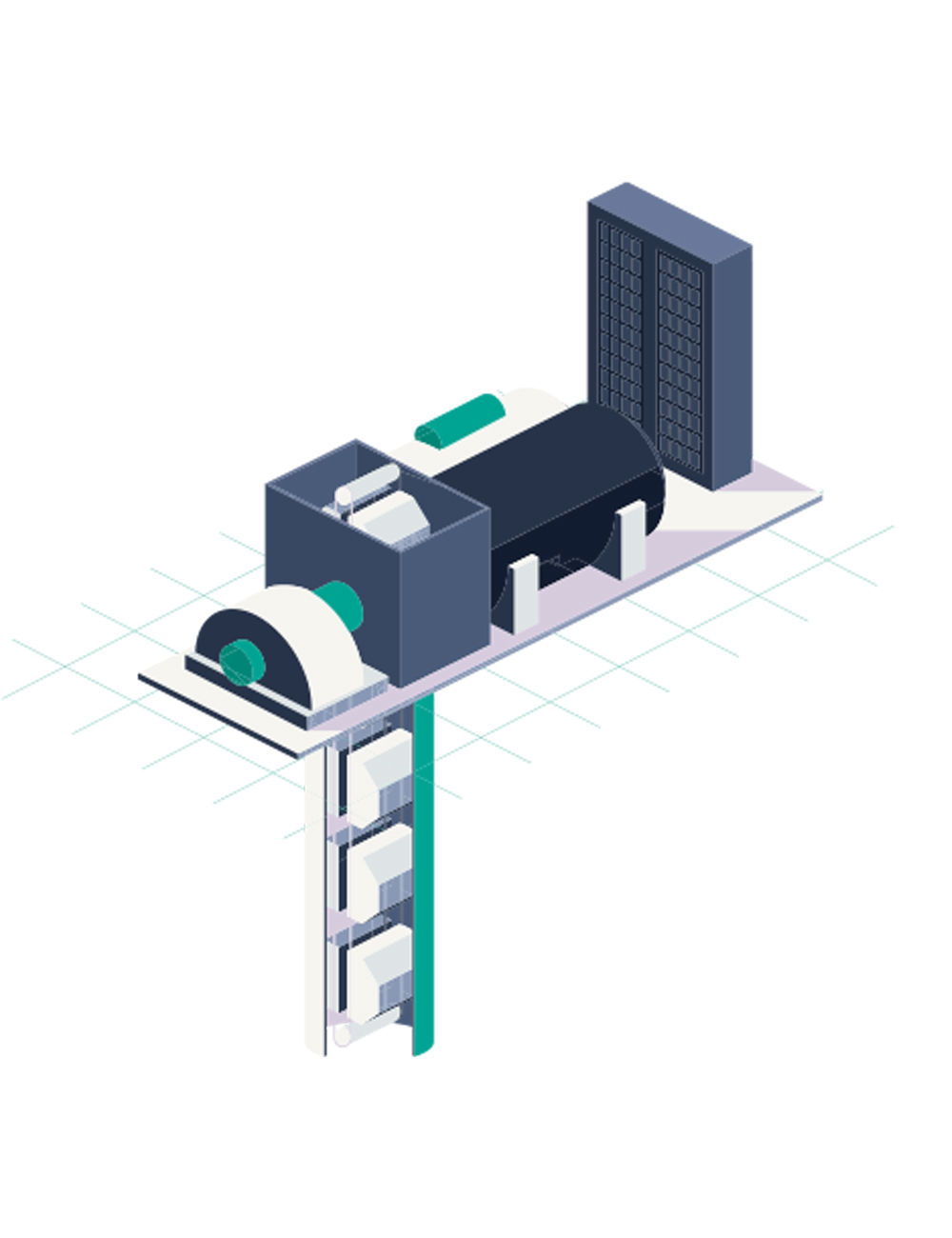 Este movimiento se traslada por un sistema de poleas al generador transformando la energía cinética a eléctrica. La energía se almacena para su uso y otra parte se redirige al compresor, generando un sistema autosuficiente.